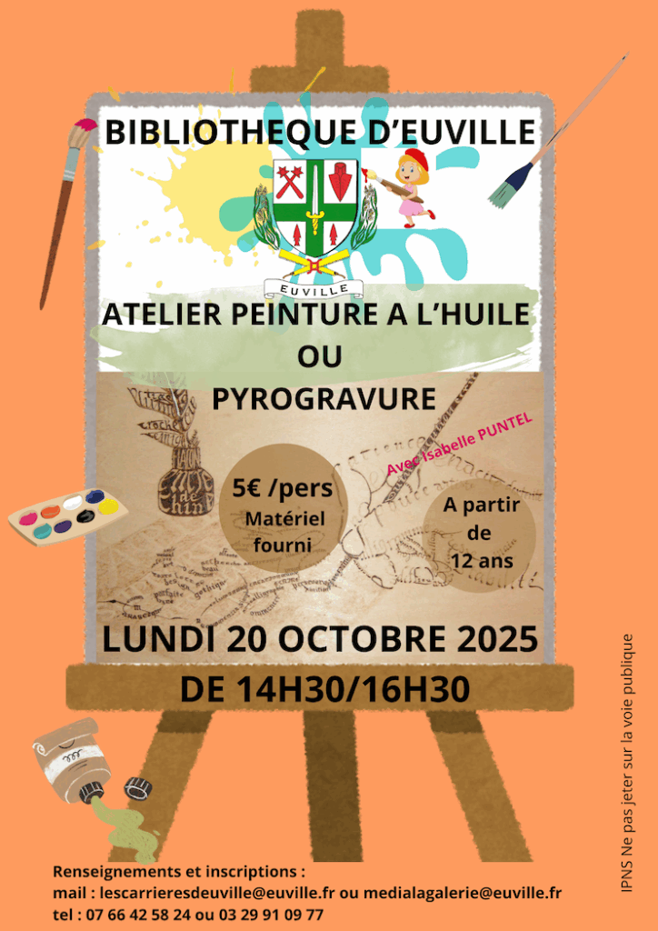 Atelier peinture Auteur/autrice de la publication :admin-euville Publication publiée :17 octobre 2025 Post category:Informations communales Vous devriez également aimer Programme de la bibliothèque d’Euville mars 2025 4 mars 2025 Apéros concert 2 juillet 2024 Guinguette à Euville rue Civet 10 juillet 2025