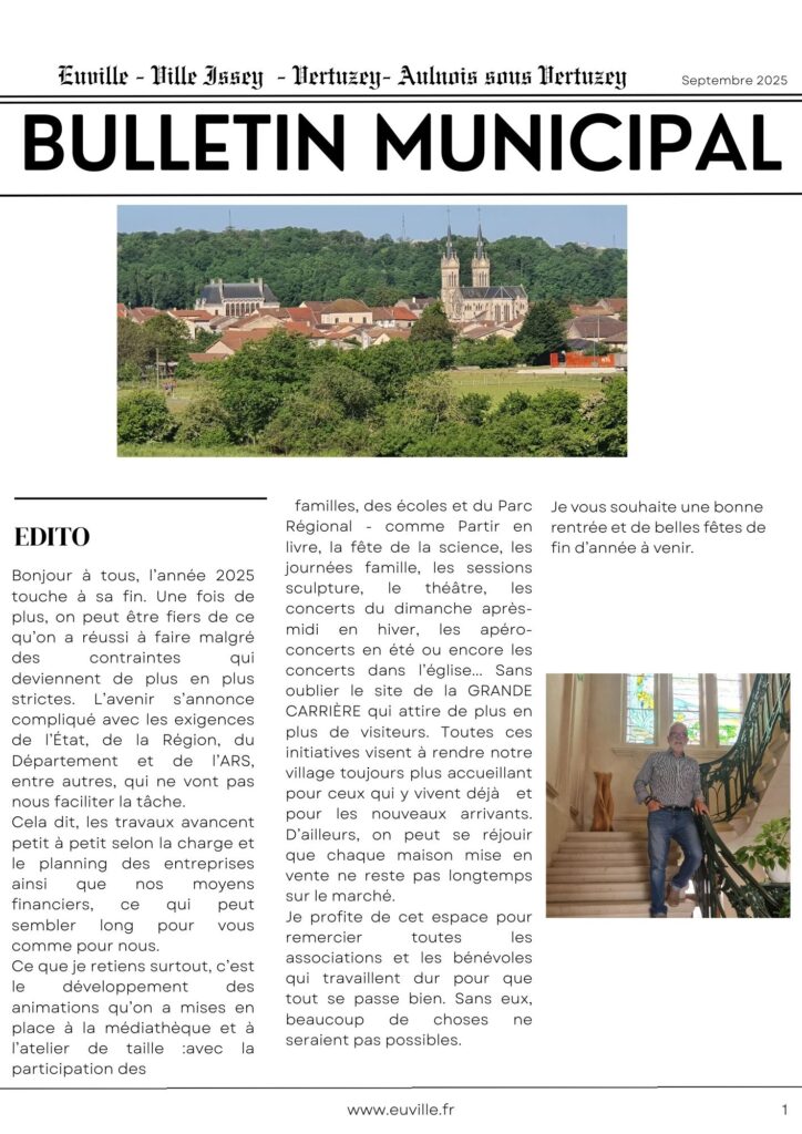 Bulletin municipal Septembre 2025 Pour lire le bulletin en entier cliquez ici Décembre 2024 Ici pour lire la suite Suite et fin du bulletin municipal 2024 Novembre 2023 Ici pour lire la suite